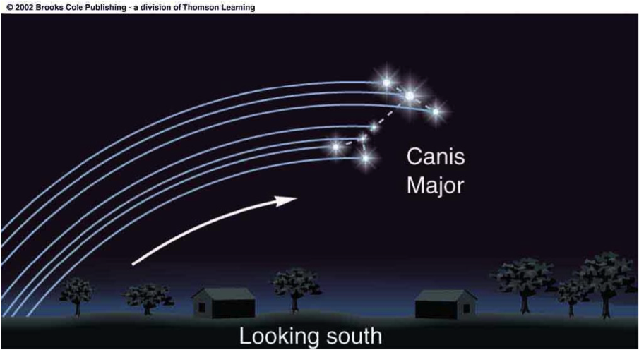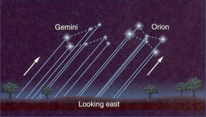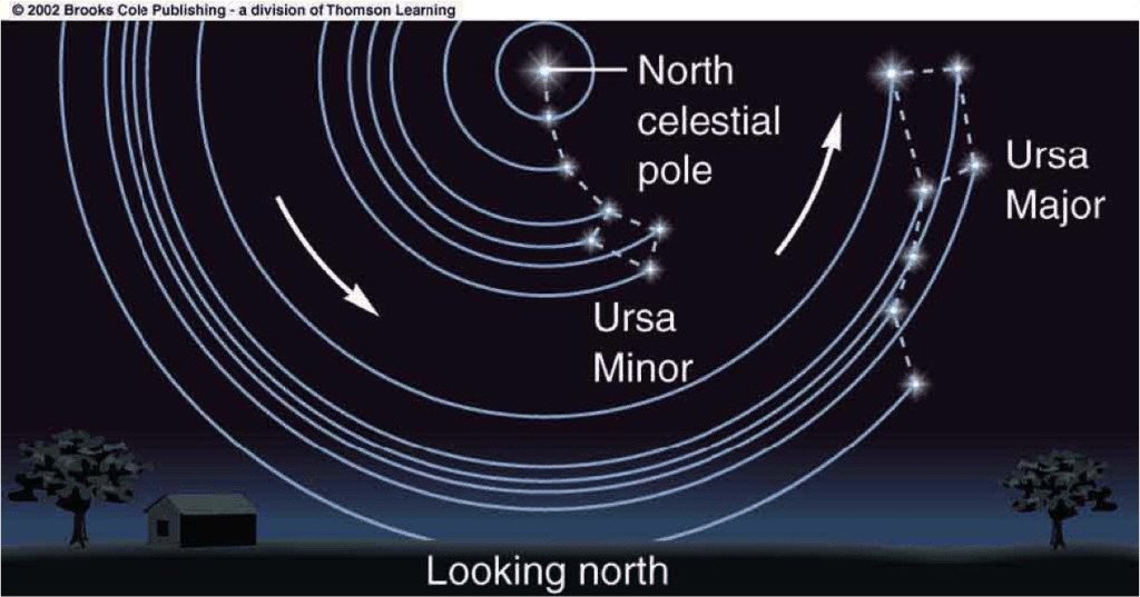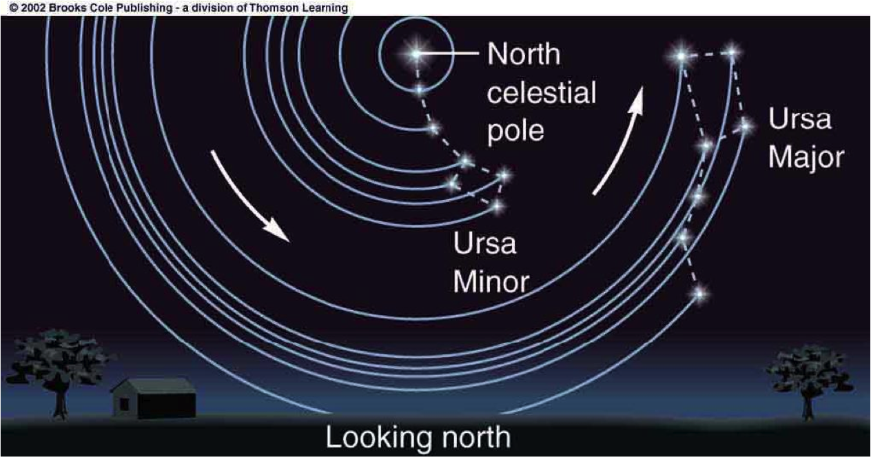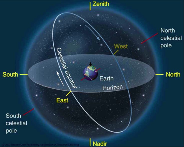 Also note the red arrow, indicating that the celestial sphere is rotating westward. This is actually the eastward rotation of the Earth about its axis. That makes it look like the sky rotates above us in the opposite direction.