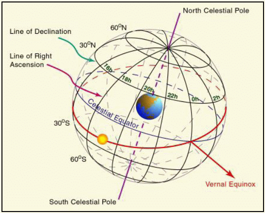 Here, you can see how a star is located using declination and right ascension. You begin at the vernal equinox. You move along the celestial equator by a certain number of hours. Then you move up or down along that line of RA, until you reach the correct line of declination.