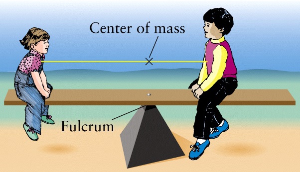(By the way, the center of mass can be thought of as like the fulcrum of a teeter-totter: If you want the teeter-totter to stay balanced, but one side is perhaps a bit heavier than the other, where do you put the fulcrum? It’s always found closer to the heavier or more massive side of the system.)