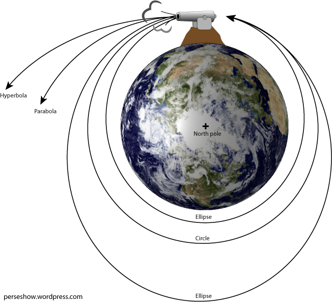 The diagram above shows the different orbits any object can have around a celestial body — in this case, the Earth. The circle and two ellipses all take the object back to its starting point. The parabola and hyperbola, however, take the object away from the influence of Earth’s gravity…into space.