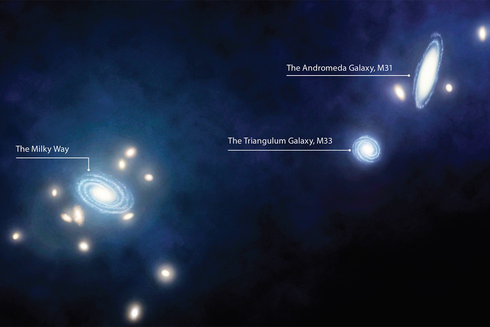 The Local Group is a galaxy cluster home to our Milky Way, our large neighbor Andromeda, the slightly smaller Pinwheel Galaxy (labeled above as M33, found in the constellation Triangulum), and many, many dwarf galaxies.