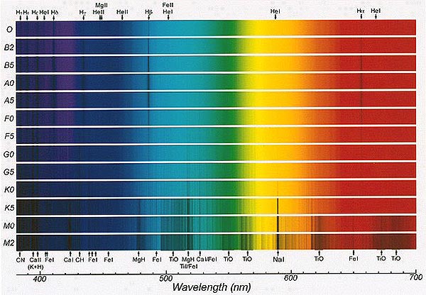 This graph shows the absorption spectrum for all the main types of stars. (The letters on the left are spectral classes.) The dark lines show where certain wavelengths of light have been blocked by elements in the stars’ atmospheres, and many are labeled (such as TiO in the coolest stars at the bottom).