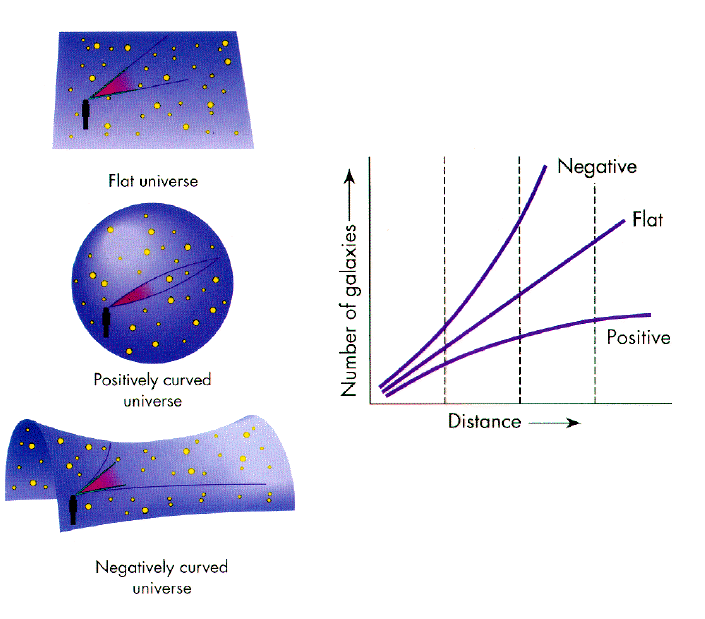 And in a negatively curved universe, lines of sight will diverge at great distances. So, the farther out you look, the more space is in your field of view — more so even than in a flat universe! So you’ll see waaaaay more galaxies than you would in a flat universe.