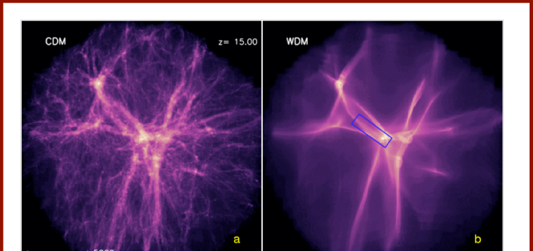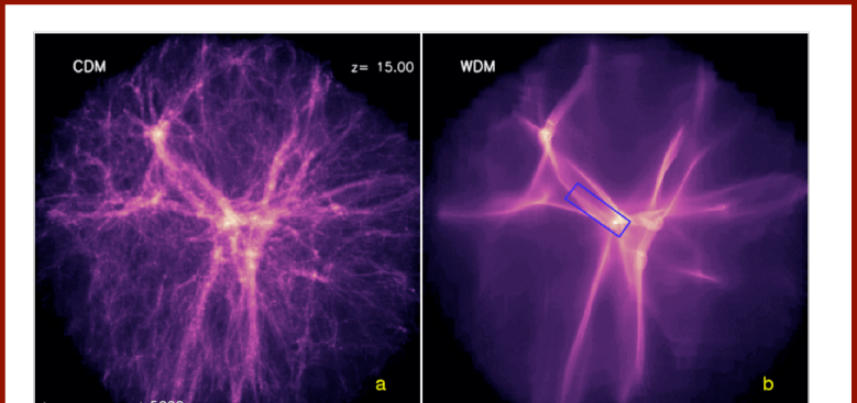 On the left, we see the filament structures that would form under the influence of cold dark matter. And on the right, we see the same for hot dark matter. (It’s abbreviated WDM, for “warm” dark matter; same difference.)