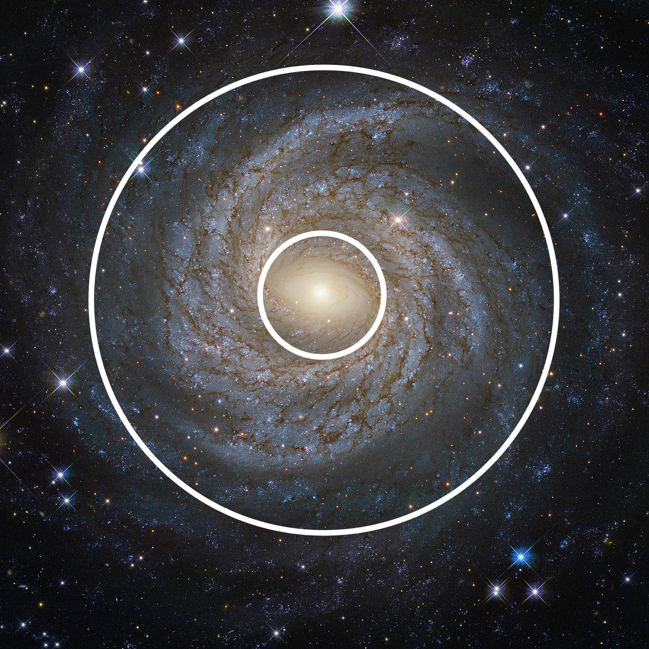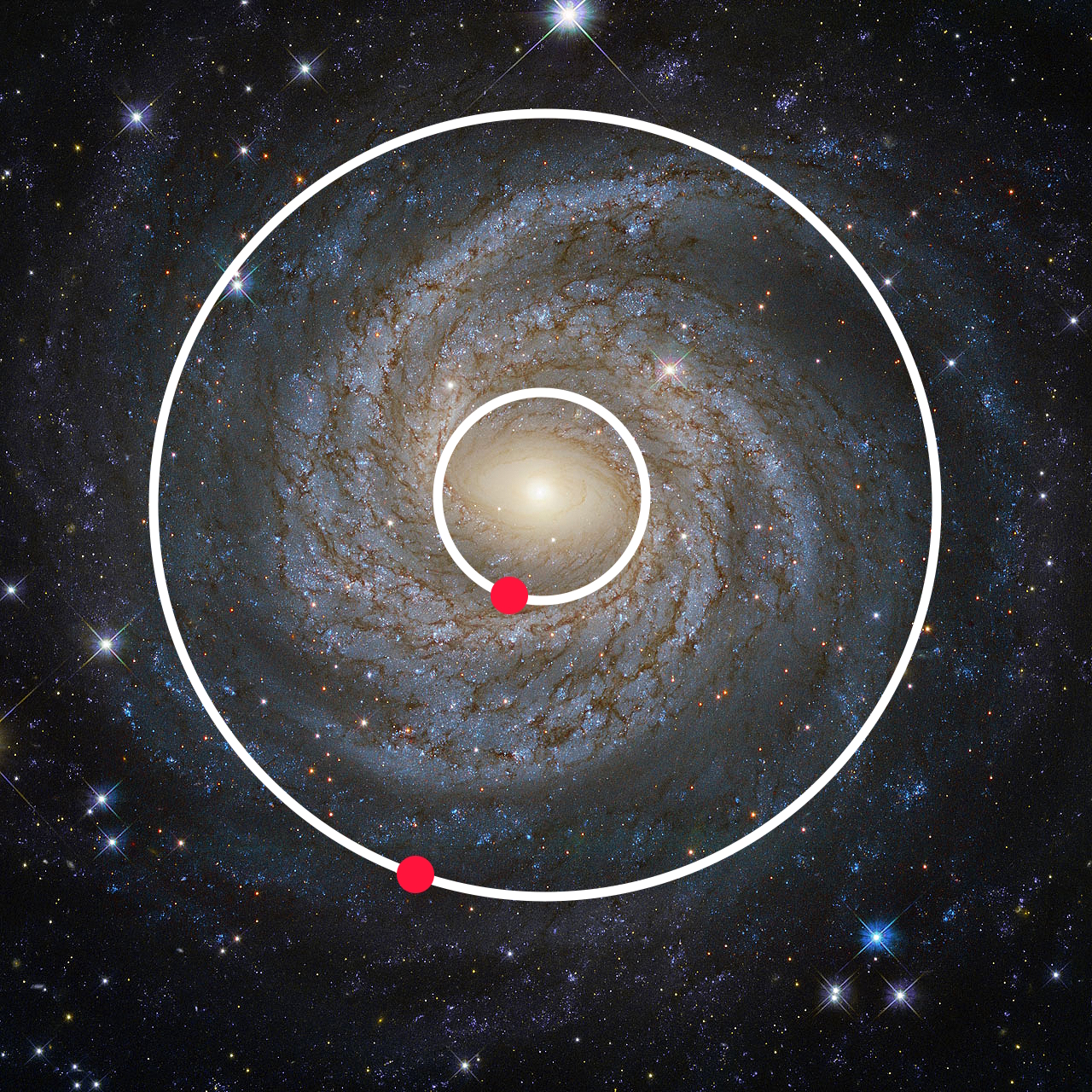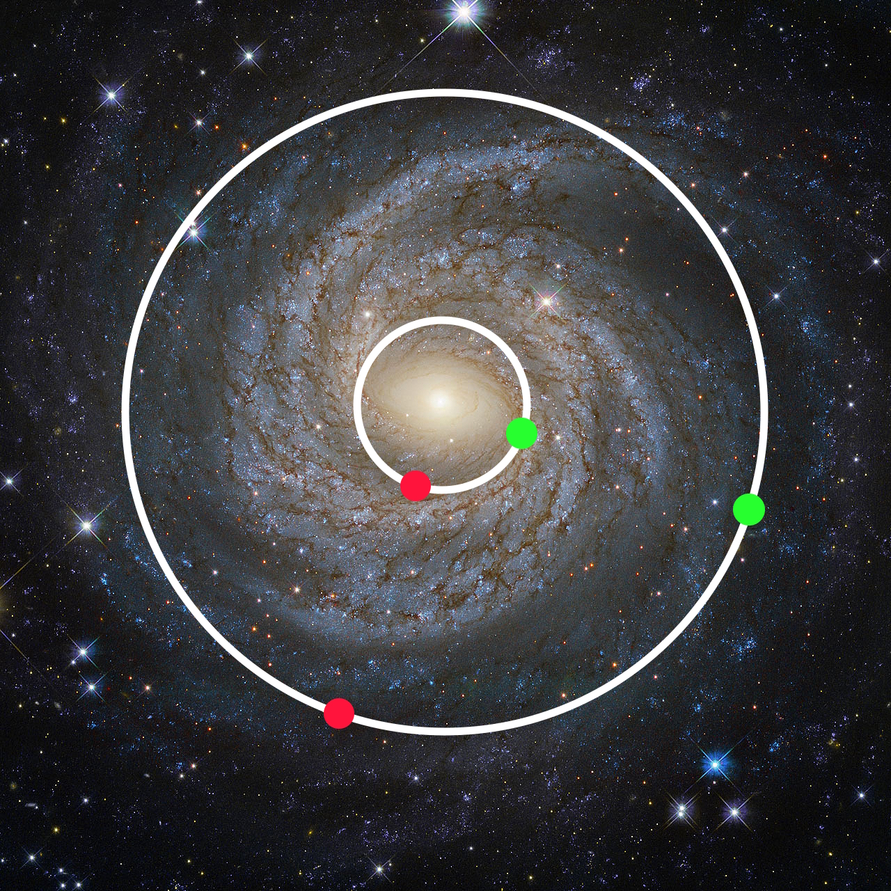 Now, let’s establish some geometry. Keeping in mind that a galaxy’s rotation is the orbital motion of its stars, let’s draw the orbital path of a star on the outside and the orbital path of a star closer to the nucleus.