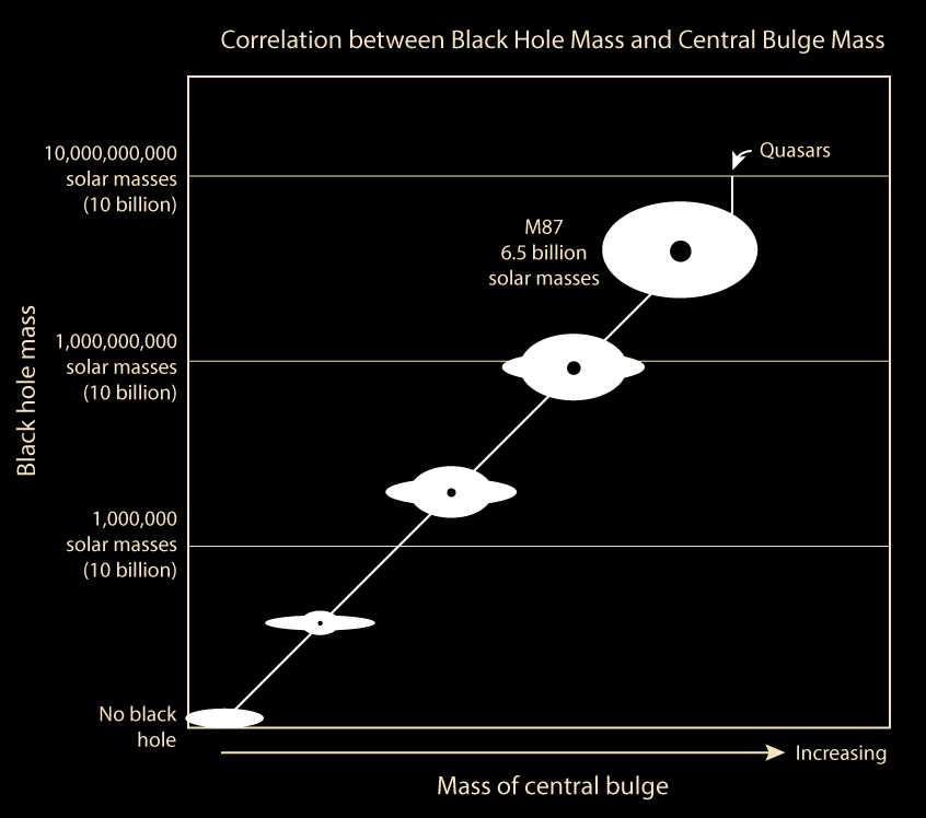 These supermassive black holes reside in the center of their host galaxies. And astronomers have observed that their masses correlate to the mass of their host galaxies’ nuclear bulges…