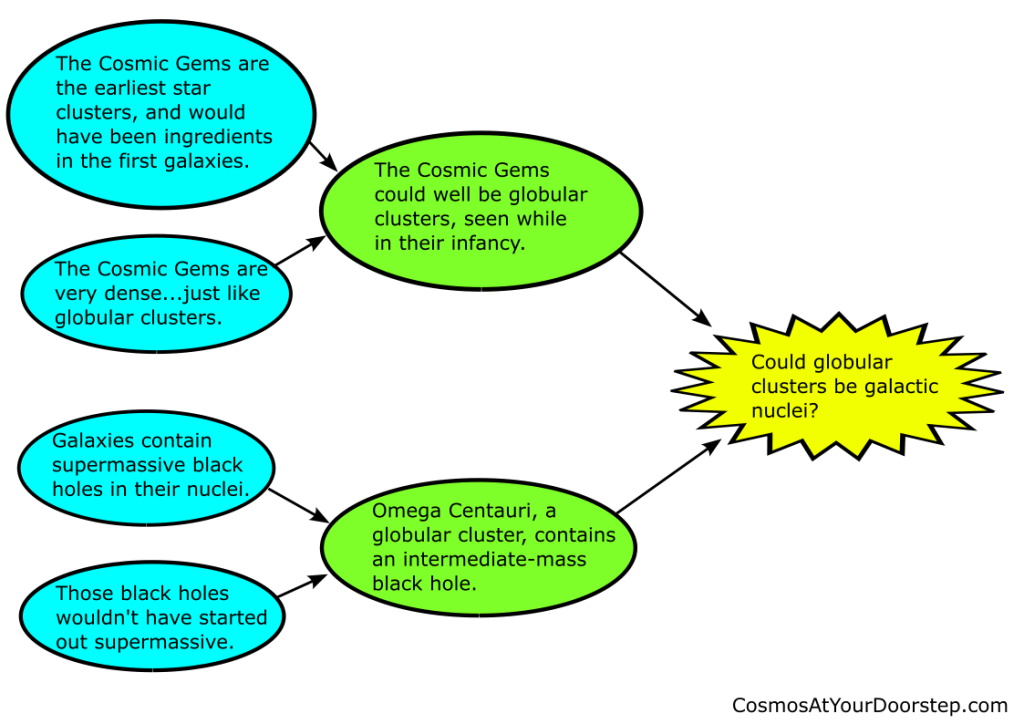 The Cosmic Gems — the earliest star clusters — might well be early globular clusters, and we know that they were ingredients in the first galaxies. That would seem to indicate that globular clusters were ingredients in the first galaxies.