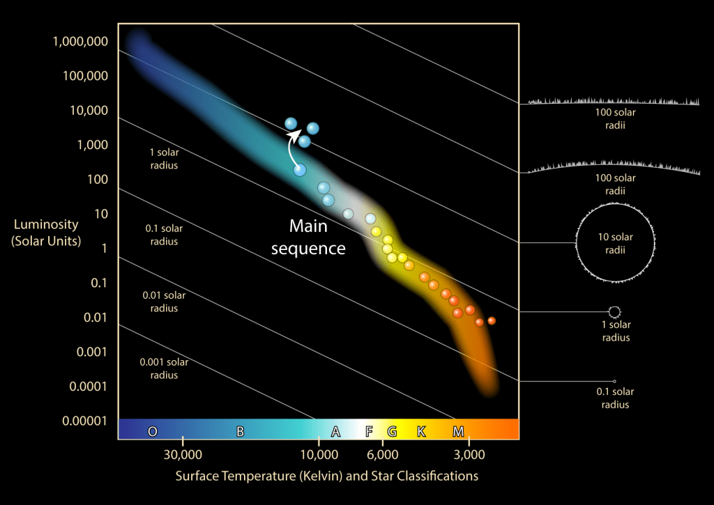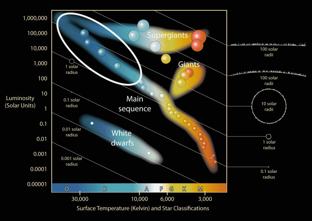 That’s just the surface. The core of a star is exponentially hotter than that. Such a star burns hot and bright — no surprise that we find it so high on the “luminosity” axis! But, more importantly, these stars live very short, explosive lives.